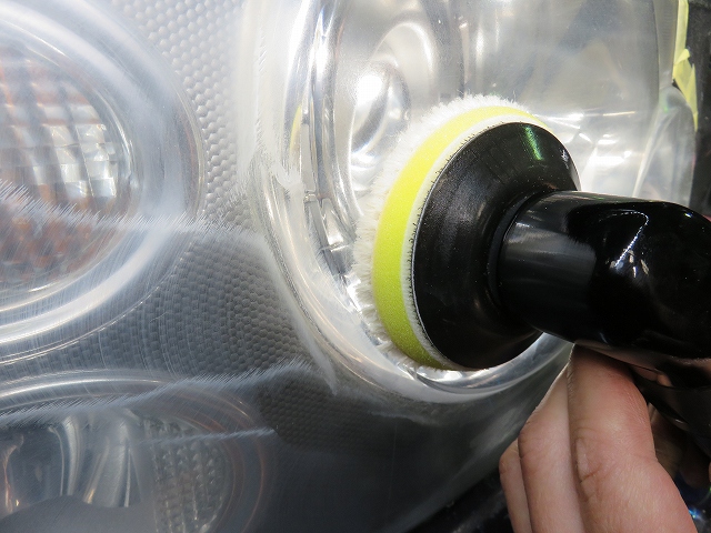 ヘッドライト表面を水研ぎし、微小傷も消しなめらかに施工します。