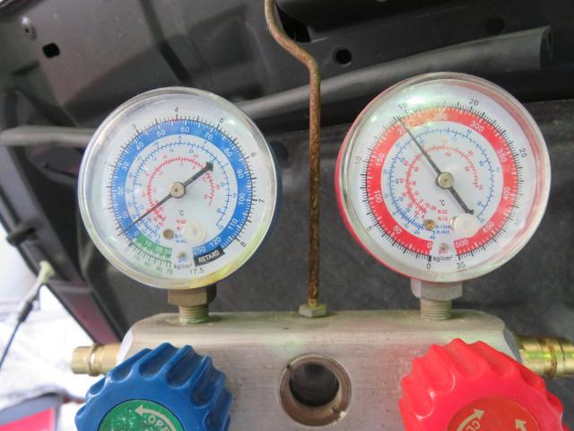 【診断/原因】エアコンが冷えない診断のため、エアコンゲージをガス低圧側と高圧側の配管に接続して測定致しました。